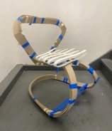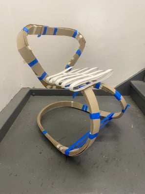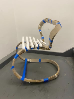 So ist der Loop Stool entstanden! Nun stand ich vor der Herrausvorderung eine Form zu finden die drei eigenschaften inne hat, sie soll stabiel sein, eine wahre dreidemensionale Möbiusschleife bilden (heißt es gibt nur 2 Seiten und Kanten), und einfach zu realiesierende Biegungen besitzen. Nach langem hin und her probieren im Virtuellen raum habe ich letztendlich die hier zu sehende Form gefunden und mit der Planung für die Umsetzung des Prototypen begonnen. Ich habe Formen für die Dampfbiegungen vorbereitet, die Grundschnitte geplant und umgesetzt, diese dann in 5mm Scheiben geschnitten um das Biegen zu vereinfachen. Ab da war es in der Theorie eigentlich nur noch ein Katzensprung bis zum fertigen Prototypen, wenn nichts Schief geht...