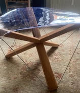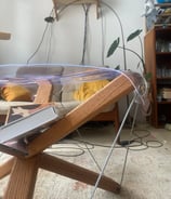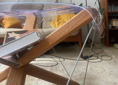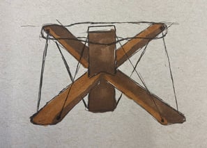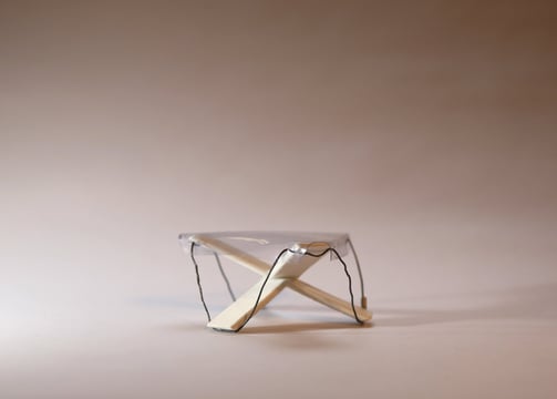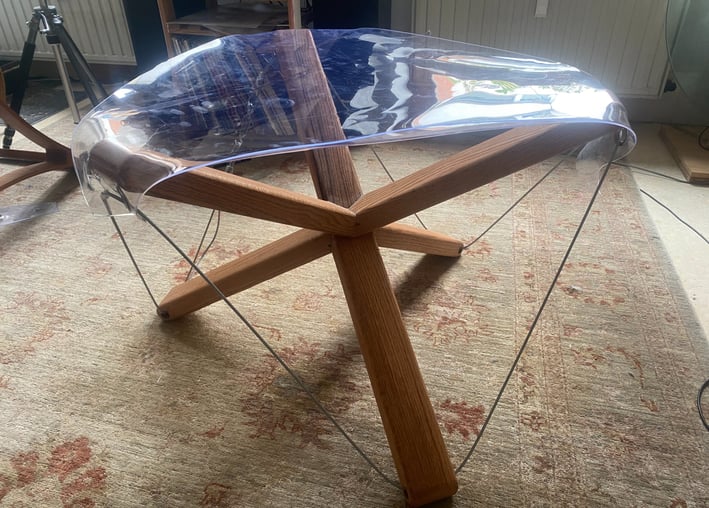 Da holz sehr stabil, optisch ansprechend und hochwertig ist sowie vergleichsweise leicht ist, habe ich entschieden dieses Material als Grundgerüst zu verwenden, da dieses den größten Teil meiner Gestaltung ausmacht. Ziemlich schnell entstand darauf hin auch die Idee das die Einzelenen Elemente des Tisches nicht wie üblich durch Schraub verbindungen zusammen gehalten werden, sondern durch das Prinzip der Spannung welches letztendlich Namensgebend für das Design war. Inspiriert durch diverse Glastische hatte ich die Tischplatte als Transparent im Kopf, da ich beim Thema Coffeetable automatisch auch an eine zweit nutzung des Tisches als Display für diverse Lektüren im Sinn hatte. Nachdem ich ein grobes Bild für den Tisch in meinem Kopf entwickelt hatte, habe ich mit der gestaltung begonnen. Während ich über die verwendung des Materials Metall nachdachte kamen mir Stahlseile welche mit einem schraubspanner leicht unter spannung gebracht werden können in den sinn, diese sollten das Fixirende Element in der gestaltung spielen. Durch Ösen in der Plastikfolie erzeugen diese eine Spannung, die nicht nur den Oberen Teil des Gestells auf dem unteren Fixiert, sondern auch die eigentlich schlaffe Plane so unter Spannung setzten das eine stabiele Fläche entsteht, welche die Funktion als Tisch erst möglich macht.