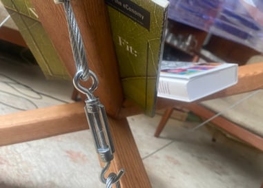 Drei Materialien unterschiedlichen Ursprungs bilden mittels der durch das Stahlseil erzeugten spannung eine Einheit die das Abstellen von verschiedenen Gegenständen erlaubt.